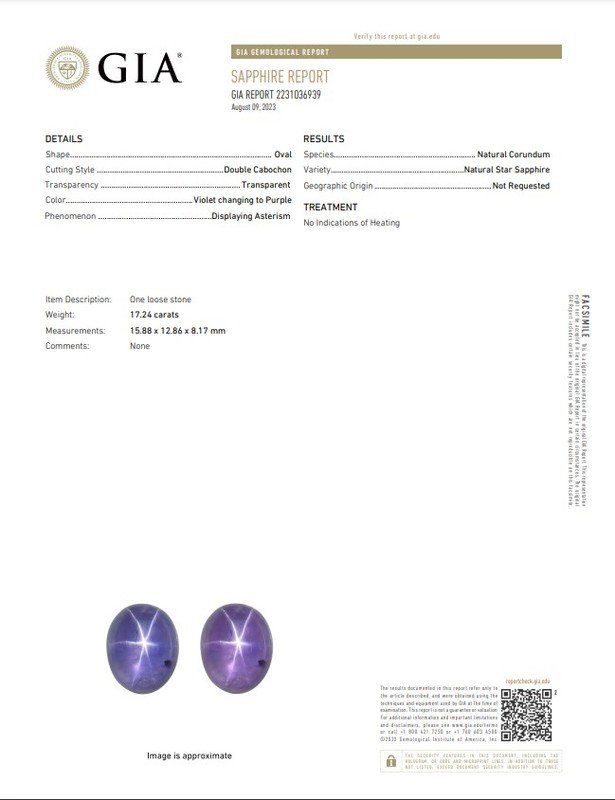 GIA, 2023, Report No. 2231036939, 17.24 carats, Natural Corundum, Star Sapphire, Violet changing to Purple color, No indications of Heating