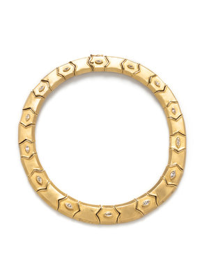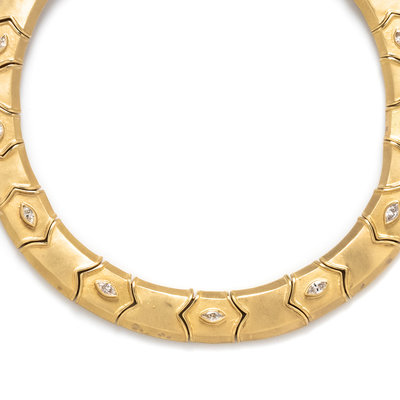 Designed as a matte finish collar set with fourteen marquise diamonds weighing approximately 1.25 carats total, hidden box and plunger clasp. 15 inches long.