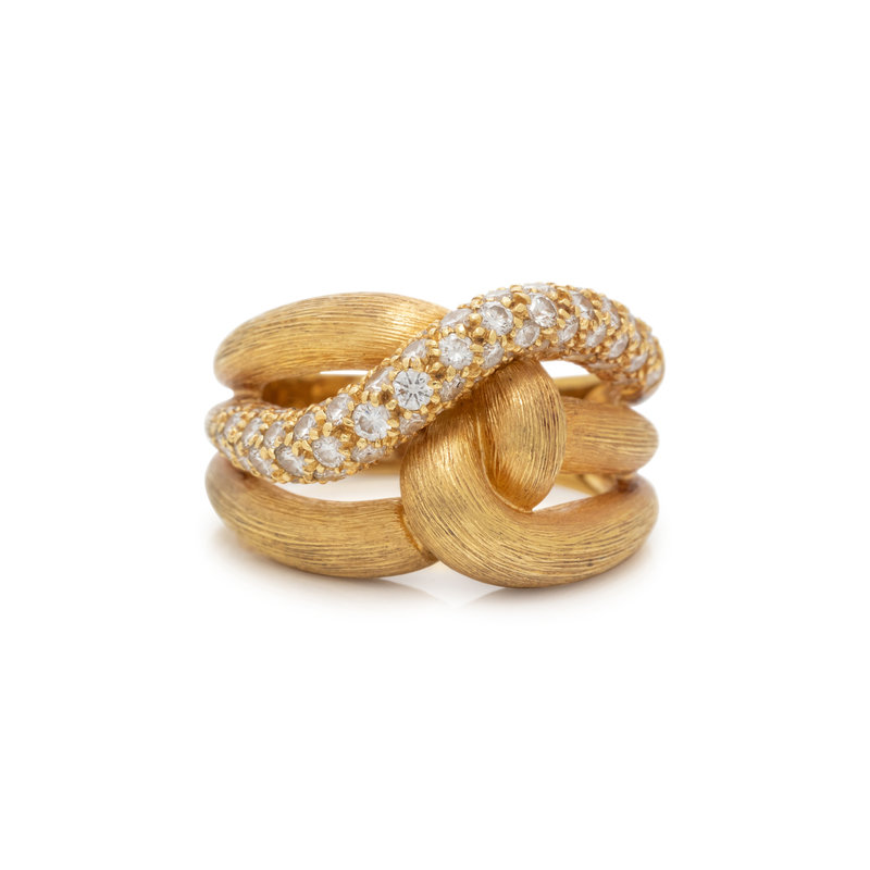 Containing approximately 75 round brilliant cut diamonds weighing approximately 2.25 carats total, with a brushed gold finish. Ring size 9.