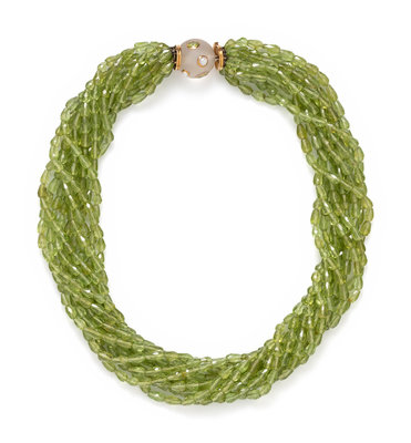 Consisting of 10 strands of faceted peridot beads, with frosted rock crystal, pearl, peridot and yellow gold clasp. 18 1/2 inches long.