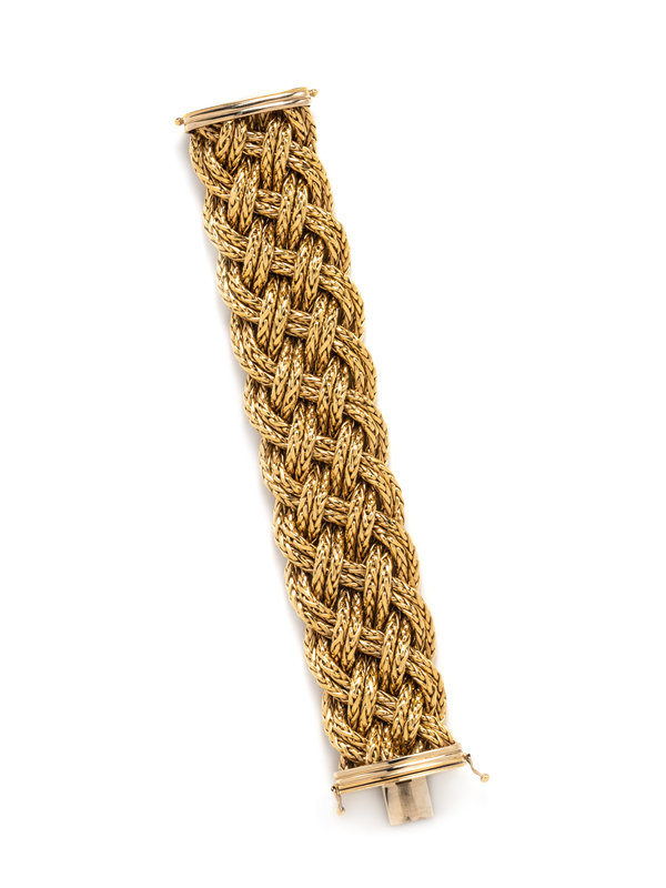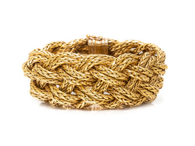 Consisting of a flexible braided bracelet measuring approximately 33.00 mm wide. 7 1/4 inches long.