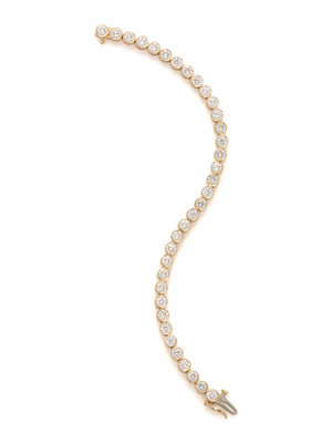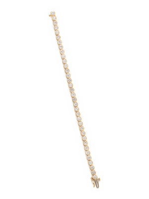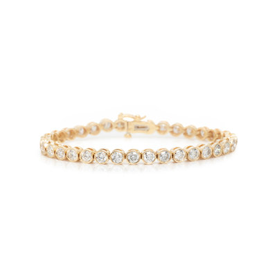 Containing 35 bezel set round brilliant cut diamonds weighing approximately 9.15 carats total. Mounted in yellow gold. 7 inches long.