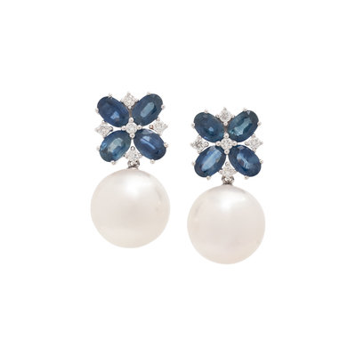 CULTURED SOUTH SEA PEARL, SAPPHIRE AND DIAMOND EARRINGS