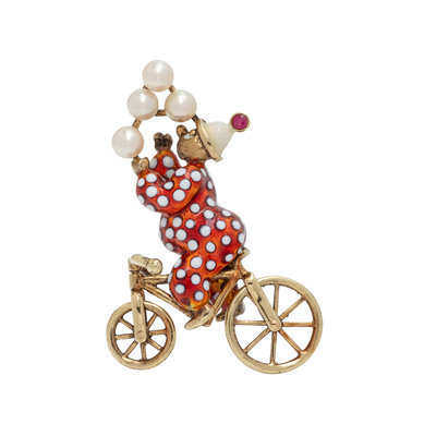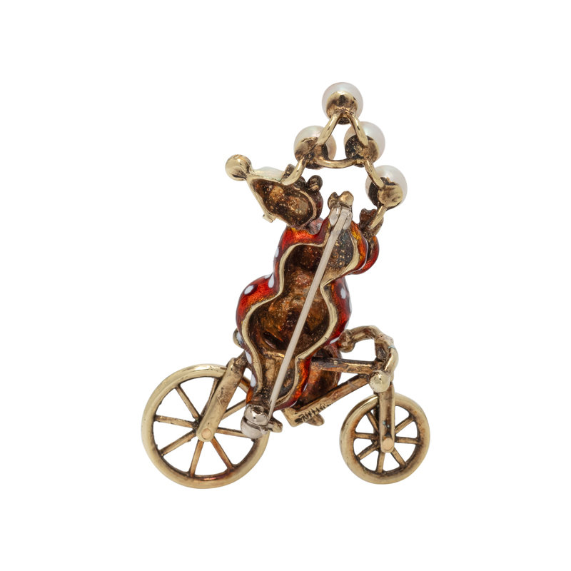 Consisting of a clown riding a bicycle juggling four cultured pearls, with enameled body and ruby hat. 2 x 1 1/4 inches.