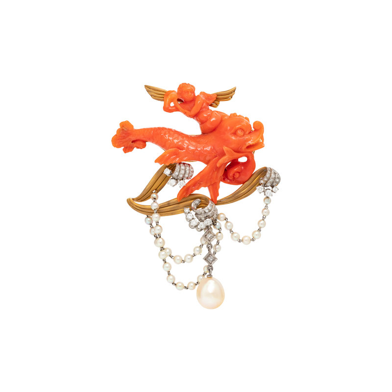 Consisting of a carved coral cherub and sea creature motif with matte yellow gold wave surround encrusted in 65 round brilliant and single cut diamonds with seed pearl swags and cultured pearl drop measuring approximately 10.00 x 9.00 mm. Mounted in yellow gold and platinum. 2 x 3 inches.