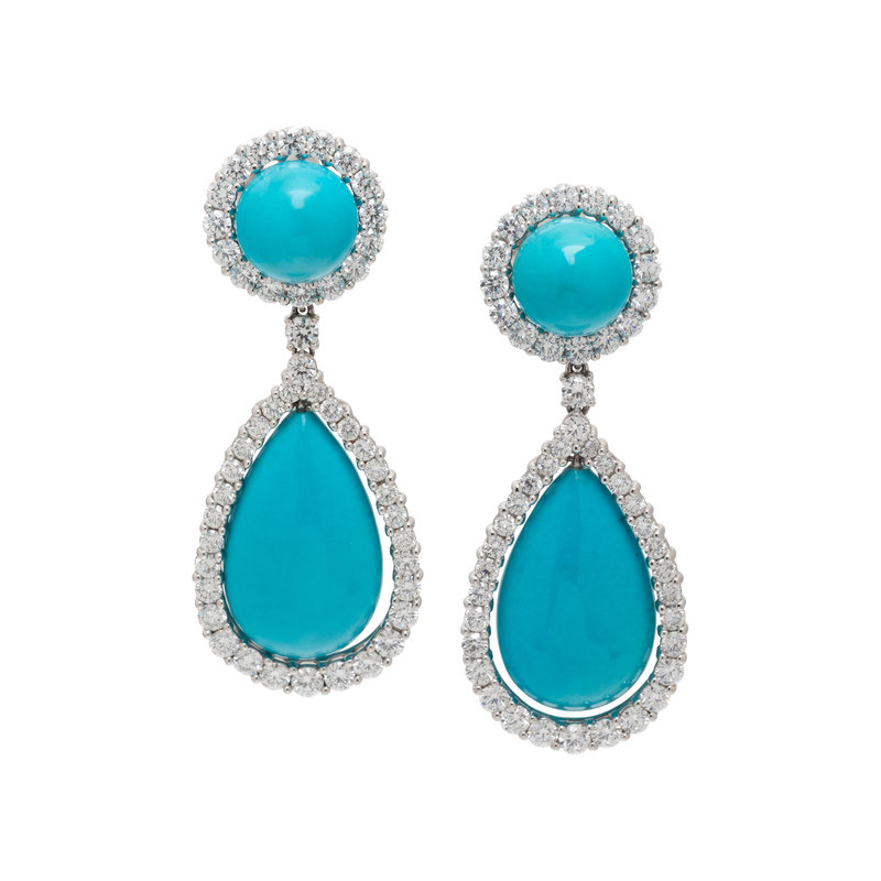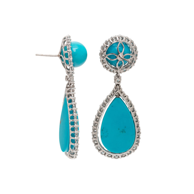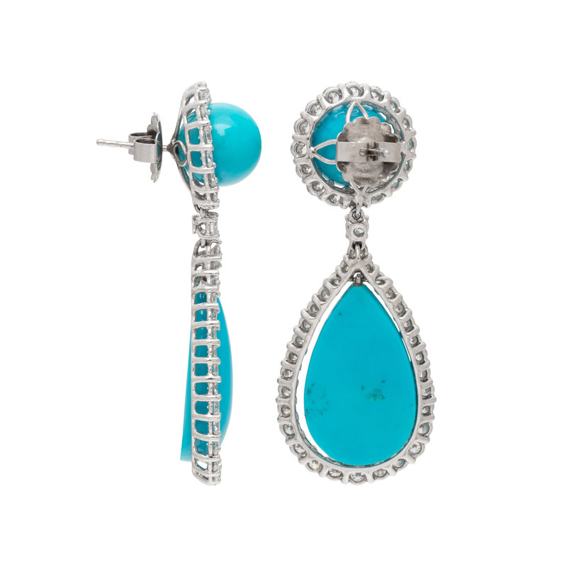 Containing two round cabochon turquoise measuring approximately 12.00 mm, two pear shaped turquoise drops measuring approximately 25.00 x 16.40 mm and 94 round brilliant cut diamonds weighing approximately 9.30 carats total. Mounted in platinum. 2 1/4 inches long.