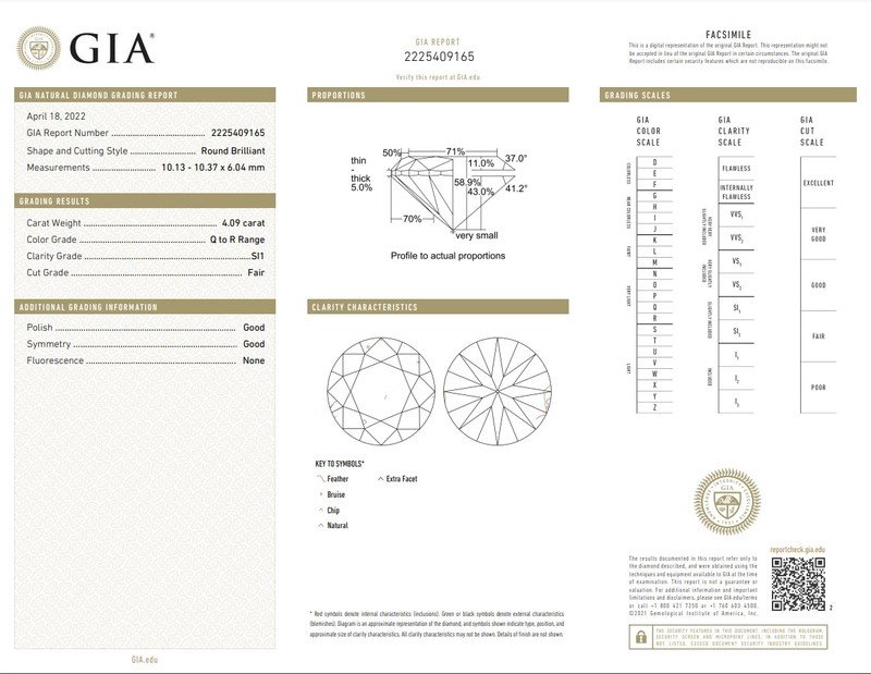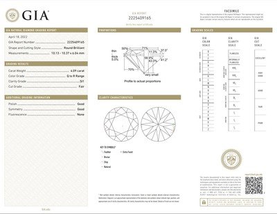 GIA, 2022, Report No. 2225409165, 4.09 carats, Q to R color, SI1 clarity, No fluorescence
