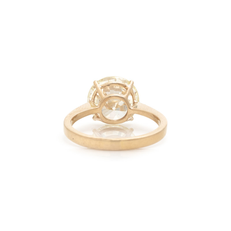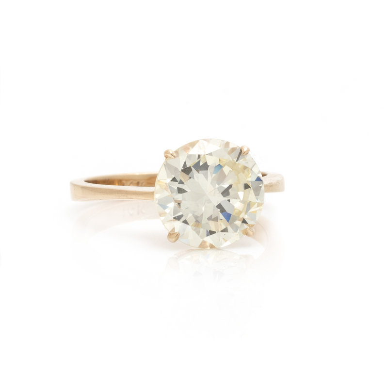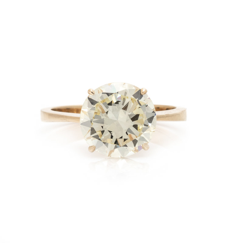 Containing one round brilliant cut diamond weighing 4.09 carats. Mounted in yellow gold. Ring size 7.