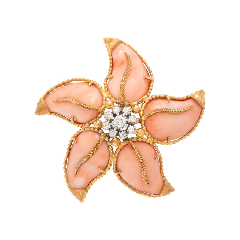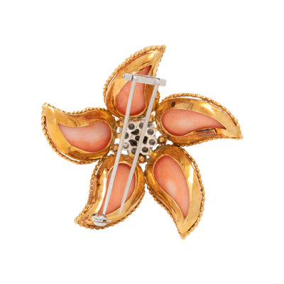 Containing five carved coral petals with center containing nine round brilliant cut diamonds weighing approximately 0.65 carat total. 2 x 2 inches.