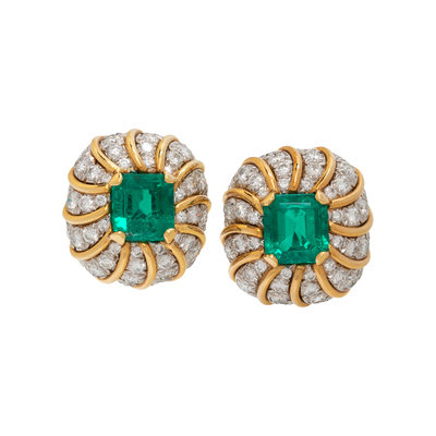 Containing two emerald cut emeralds measuring approximately 8.05 x 7.60 x 5.95 mm and 8.30 x 7.65 x 5.80 mm and 96 round brilliant cut diamonds weighing approximately 3.30 carats total, posts with clip backs. Mounted in platinum and yellow gold. 3/4 inch long.
