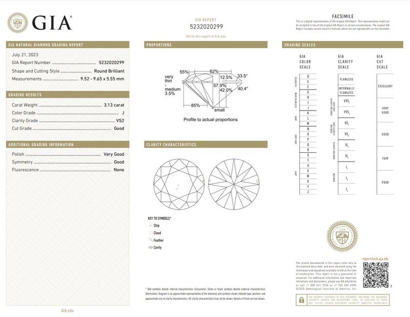 GIA, 2023, Report No. 5232020299, 3.13 carats, J color, VS2 clarity, No fluorescence