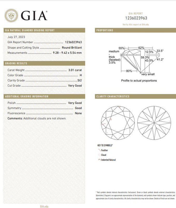 GIA, 2023, Report No. 1236023963, 3.01 carats, H color, SI2 clarity, No fluorescence