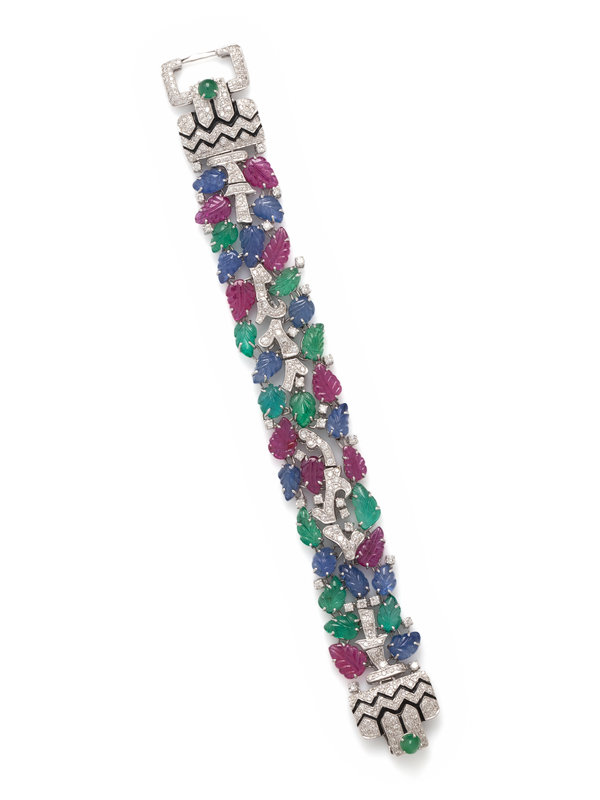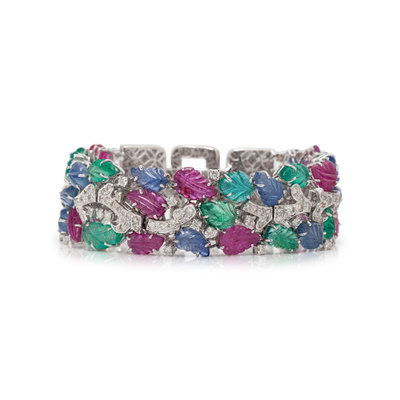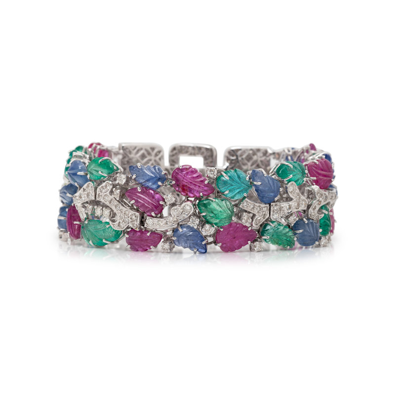 In a Tutti Frutti style, containing 33 carved leaf motif rubies, sapphires and emeralds, two round cabochon emeralds together with numerous round brilliant cut diamonds weighing approximately 7.50 carats total, and black enamel detail. Mounted in white gold. 7 1/2 inches long.
