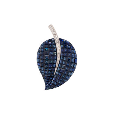 Consisting of invisibly set sapphires together with straight and tapered baguette diamonds. Mounted in white gold. 1 3/4 inches x 1 inch.