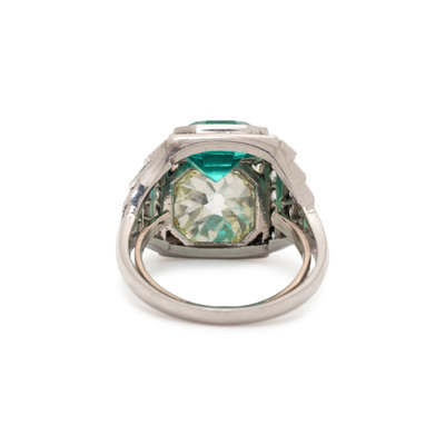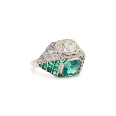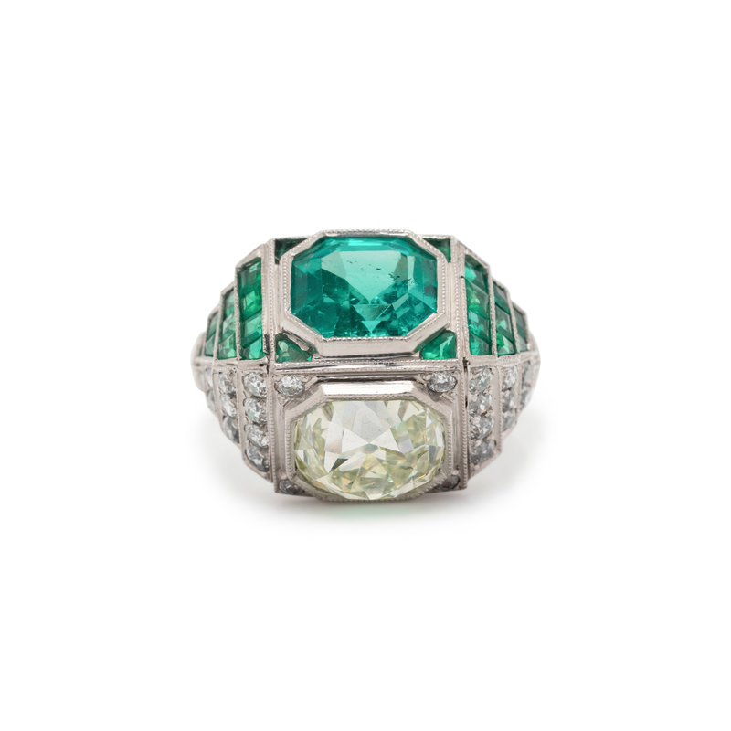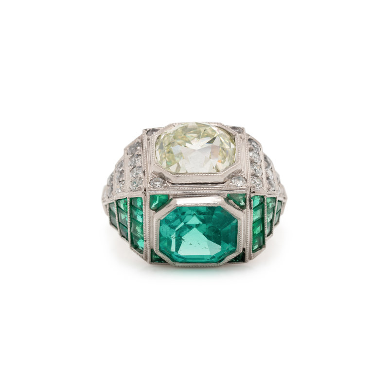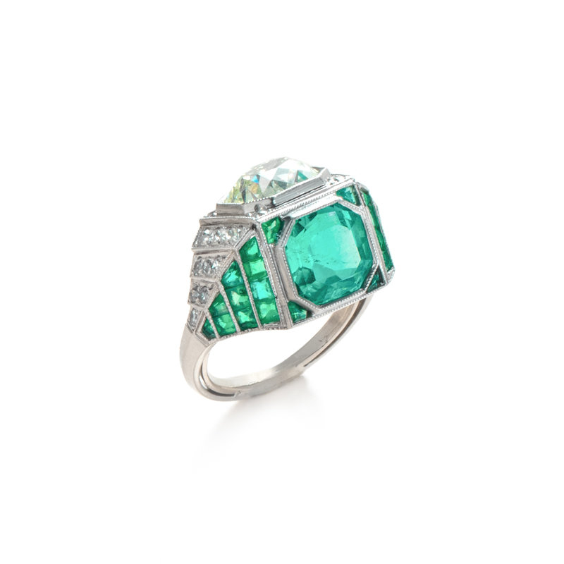 Containing one old mine cut diamond weighing approximately 3.00 carats, one octagonal step cut emerald measuring approximately 7.80 x 7.70 x 5.50 mm, 24 old mine cut diamonds and 24 calibre cut emeralds. Mounted in platinum. Ring size 4 3/4.