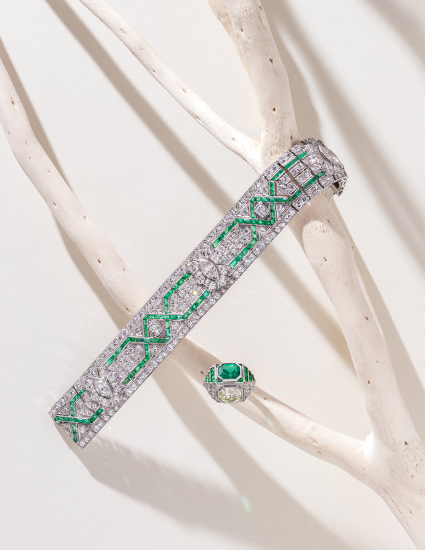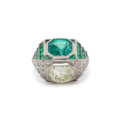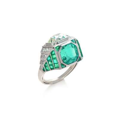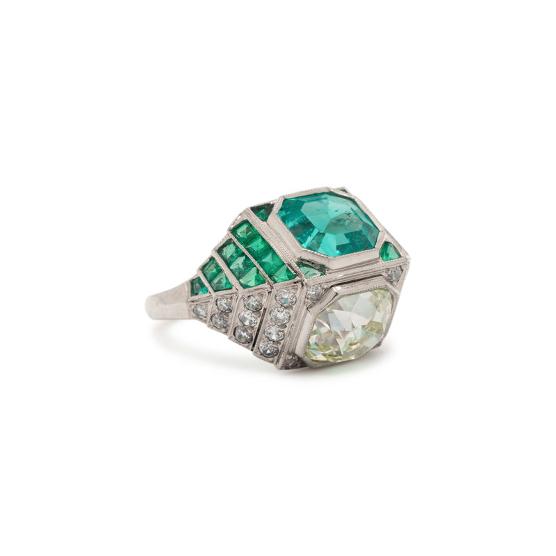 ART DECO, EMERALD AND DIAMOND SCULPTURAL 'TOI ET MOI' RING