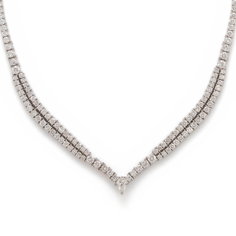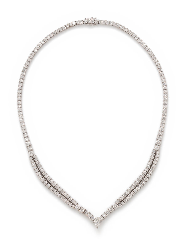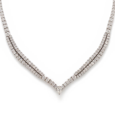 Containing one pear shaped diamond weighing approximately 0.45 carat and 175 round brilliant cut diamonds weighing approximately 12.00-13.00 carats total. Mounted in white gold. 14 3/4 inches long.