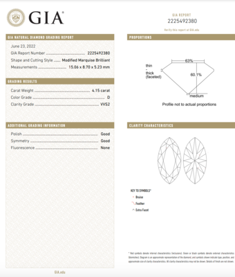 GIA, 2022, Report No. 2225492380, 4.15 carats, D color, VVS2 Clarity, No Fluorescence