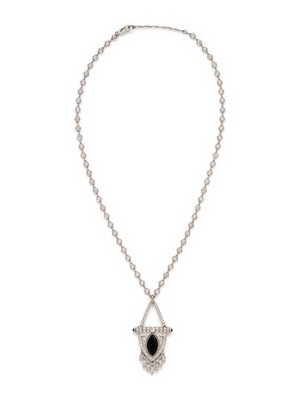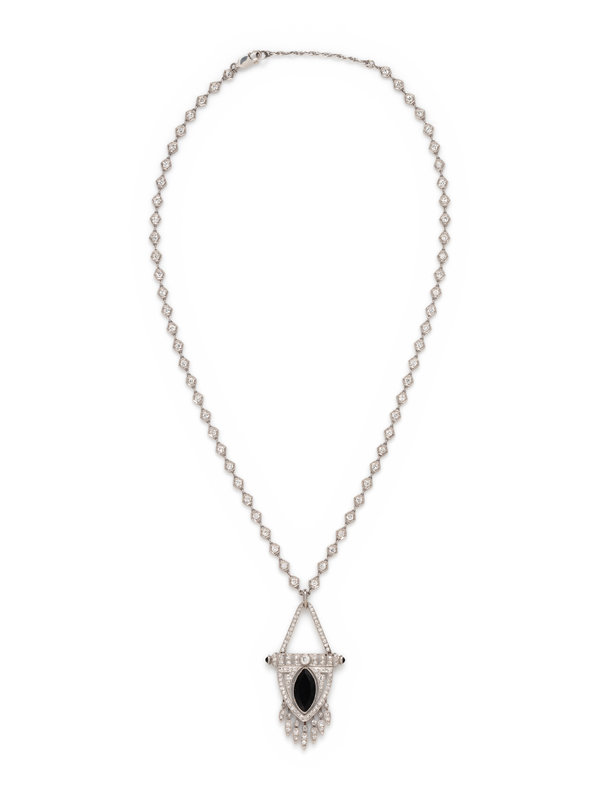 Consisting of an openwork, shield shape pendant centered by a marquise cut onyx and numerous single and full cut diamonds, all suspended from a chain containing 62 old European cut diamonds weighing approximately 1.85 carats total. Mounted in platinum.