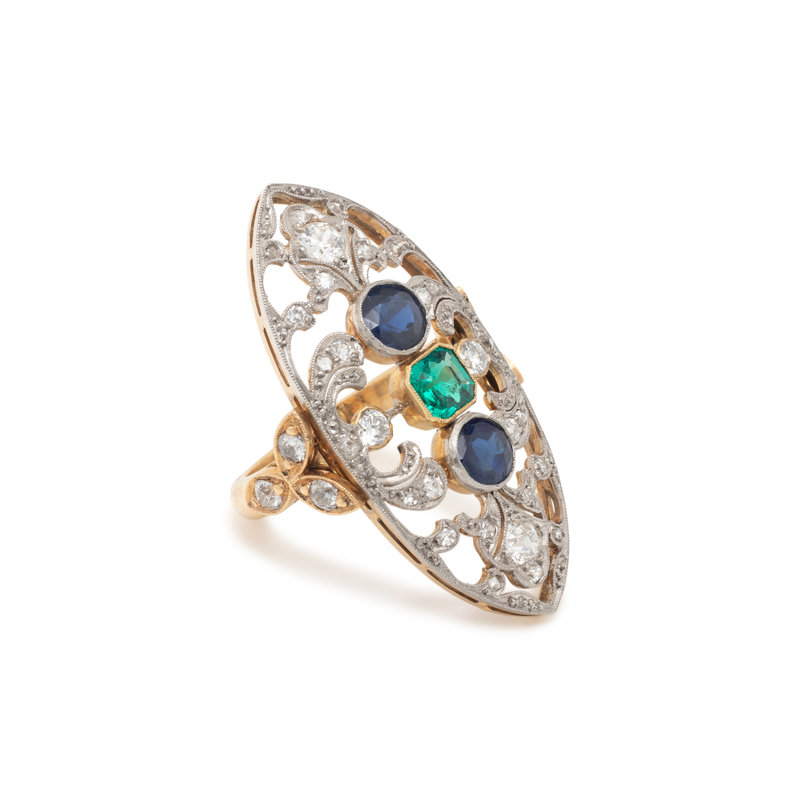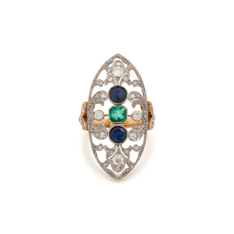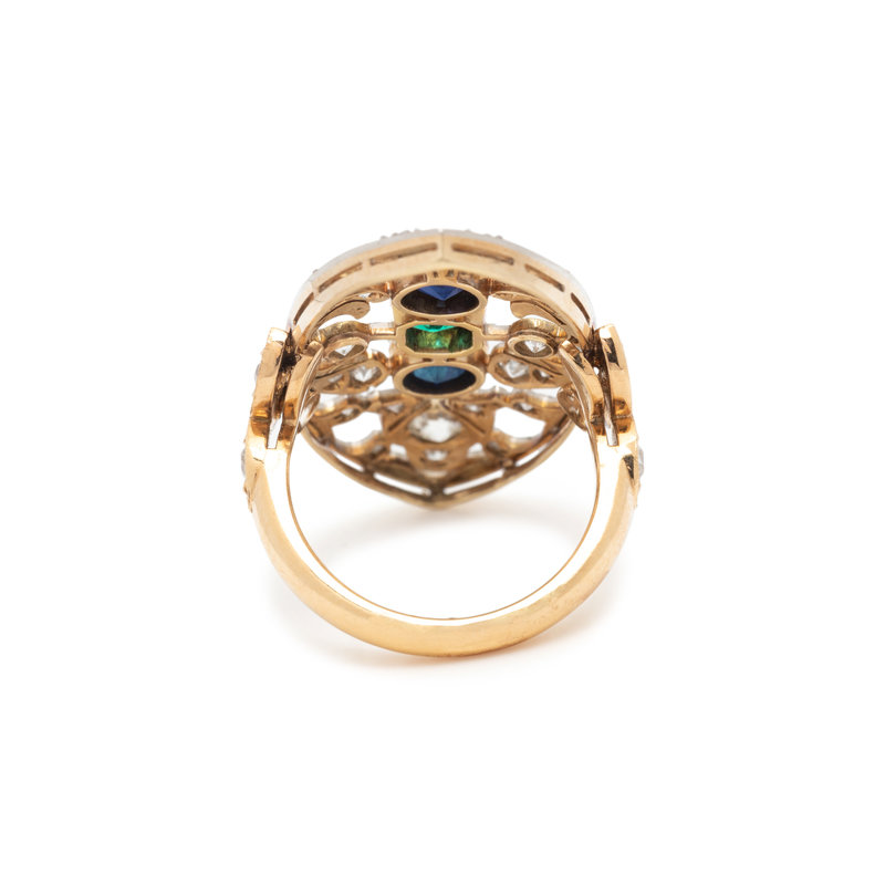EMERALD, SAPPHIRE AND DIAMOND RING
