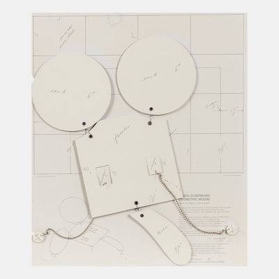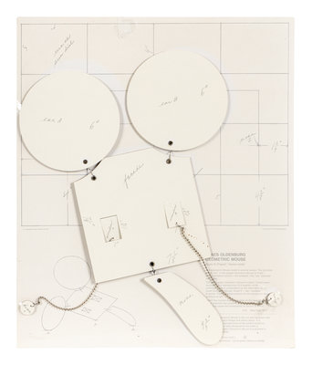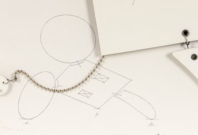 offset lithograph on gray wove paper laminated to die-cut boards with stainless steel wires, bead chains and nickel plated fasteners