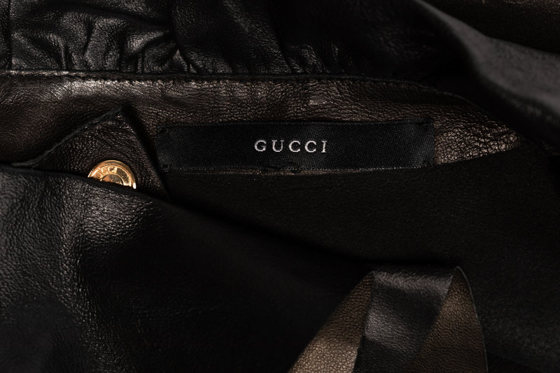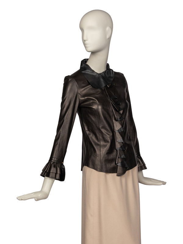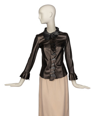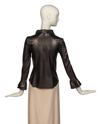 Black leather shirt with gold-tone snap closure down the center front, ruffle around the neck that cascades down center-front, dual ruffle at the cuff.