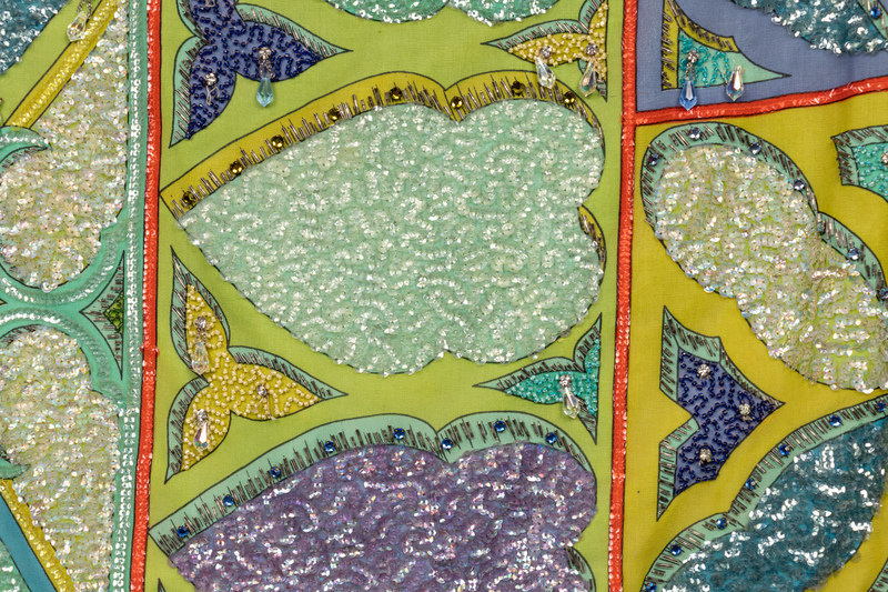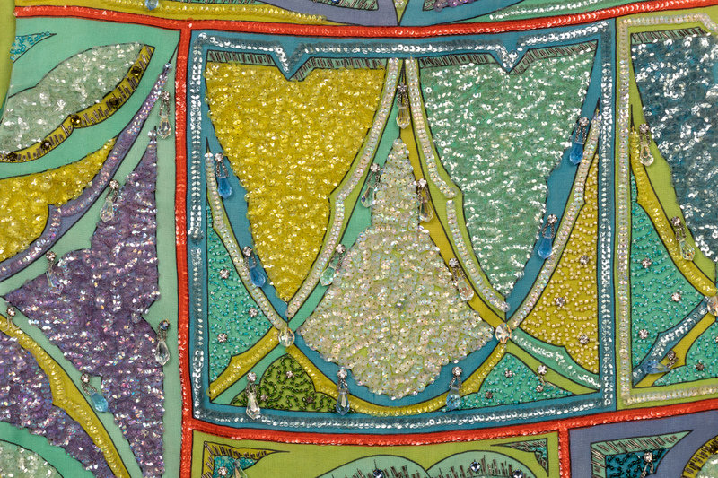 Sleeveless top in printed silk with sequin, bugle bead, and rhinestone embellishments throughout. Snap closures at shoulders. Made in Italy.