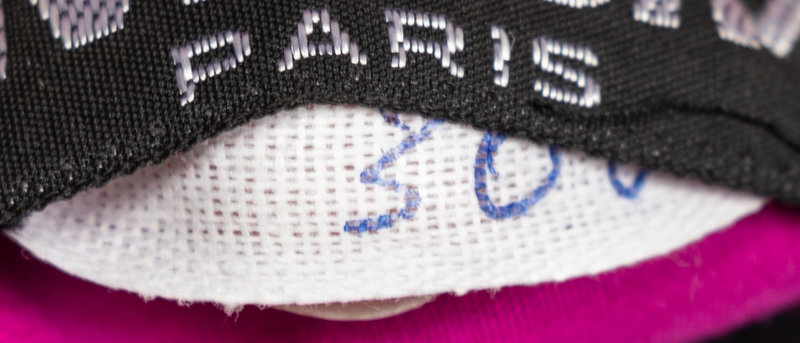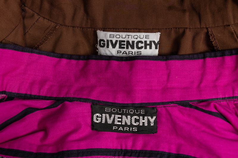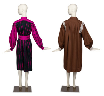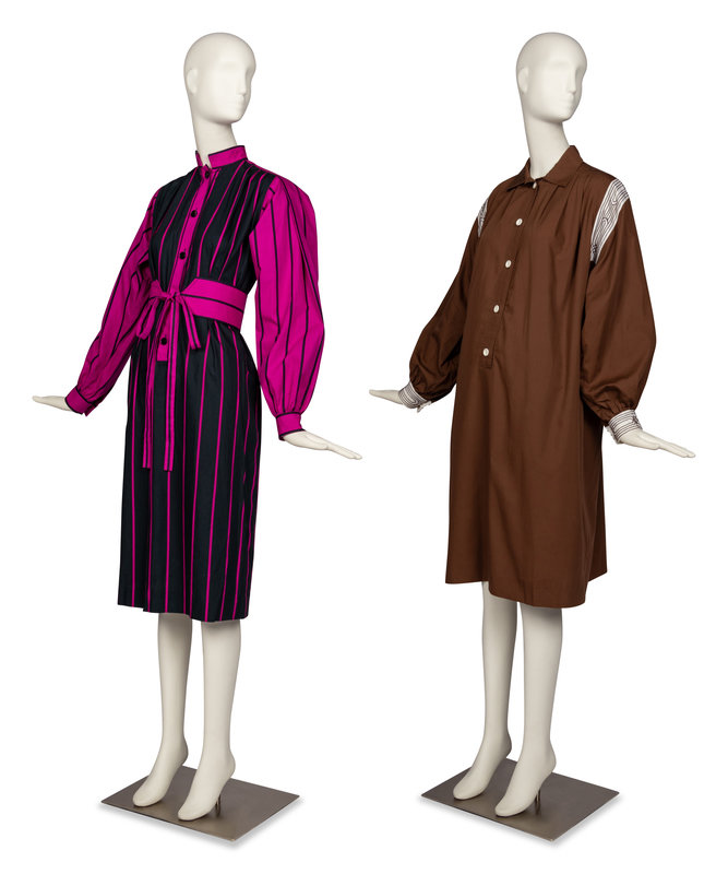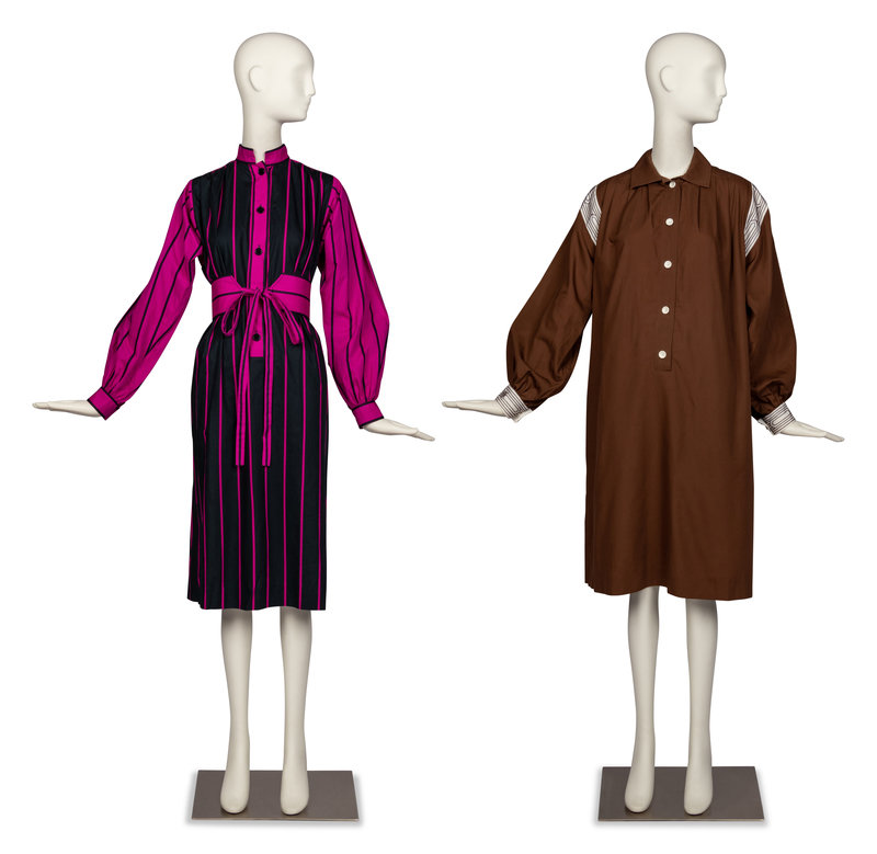 Long sleeve dress with stand collar in striped cotton. Button closure at center front with belt.
