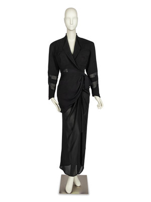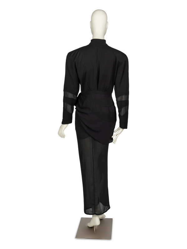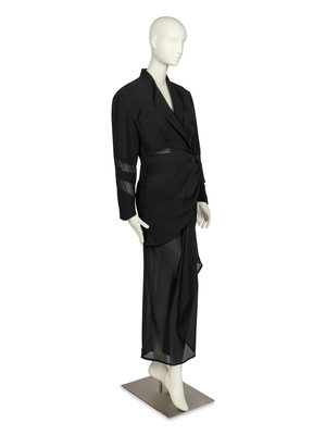 Black polyester jacket and skirt. The jacket has a stand-up collar, long sleeves, two large pockets that accentuate the chest, and a three snap closures and faux bow tie at the waist with a draped hem. The jacket is pieced with alternating panels of black transparent crepe. The wrap skirt is made of sheer black fabric that is draped into the hips that secure with a three-snap closure.