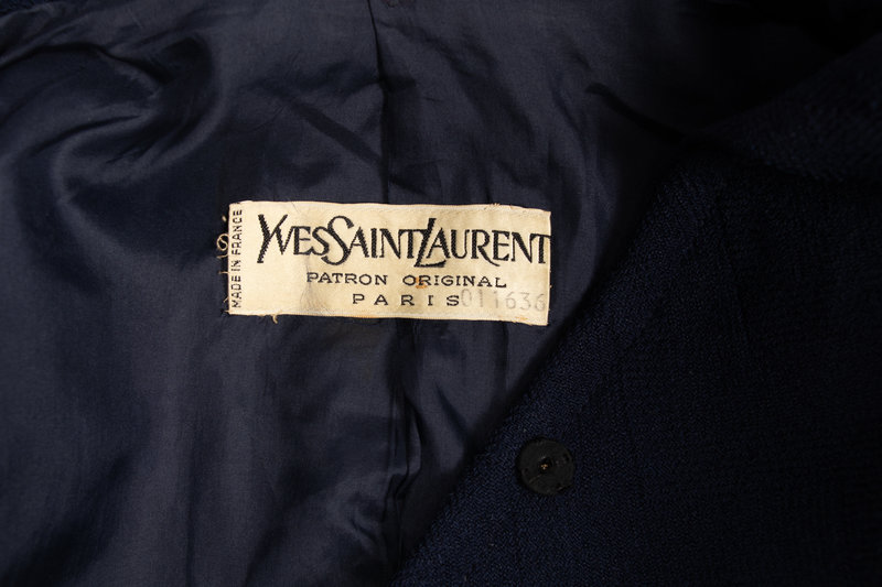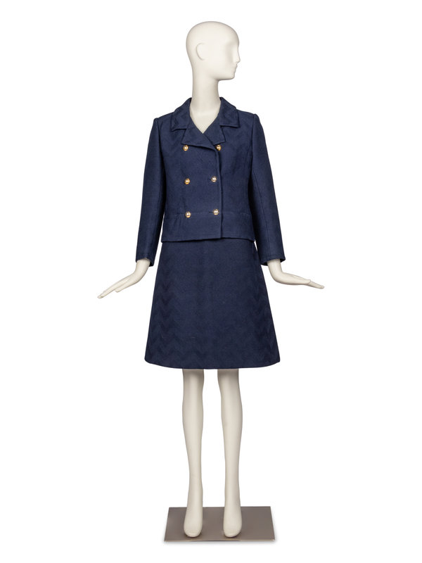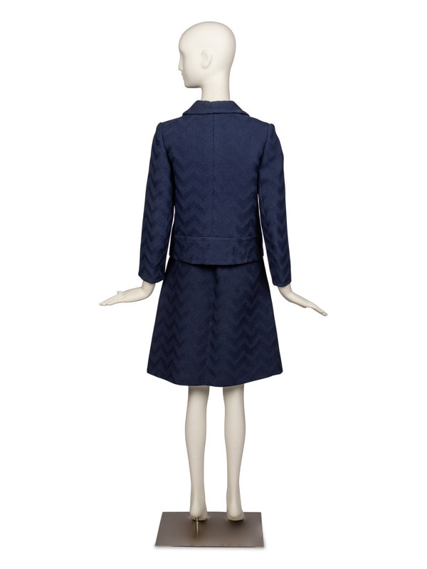 Double-breasted, short jacket with notch collar in geometric chevron navy blue wool. Jacket features gold-tone, hammered metal buttons at front closure and a weighted chain at bottom hem. Fully-lined. Made in France.