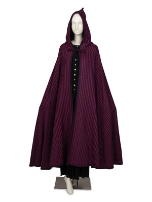 Long, hooded cape in striped, multicolor wool. Features a braided knot/loop closure at neck with wool ribbon binding at edges. Unlined. Made in France.