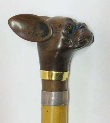Amusing English carved dog head walking cane late 19th c.