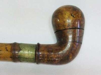 The hollowed bamboo shaft with a turned burl walnut handle unscrewing to reveal a pipe. 36 in.
