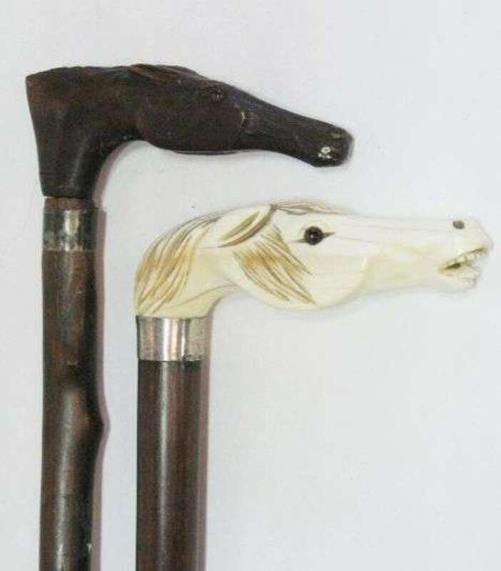 The ivory example with a 'Plum-Pudding' mahogany tapered shaft & Gorham sterling collar. 34 in. The carved wood example with a naturalistic tapered shaft. 35 in.