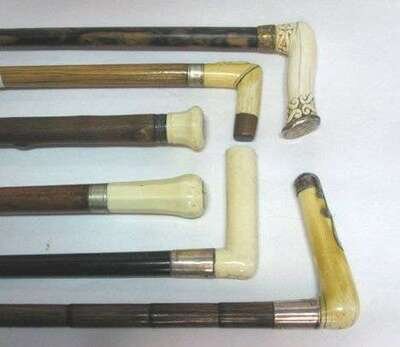 Four with L-shaped handles, one carved with a mask, another scrolls, another with silver overlay, and the other a plain example with silver collar. Birmingham, 1913, the remaining two with faceted bombe-shaped circular handles. (6).