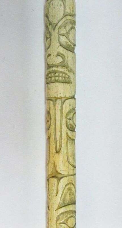 Carved with mask motifs inscribe 'T.K.A. 81', bears paper label reading '...made of whalebone bought from indian ...Glacies Alaska' 34.5 in.