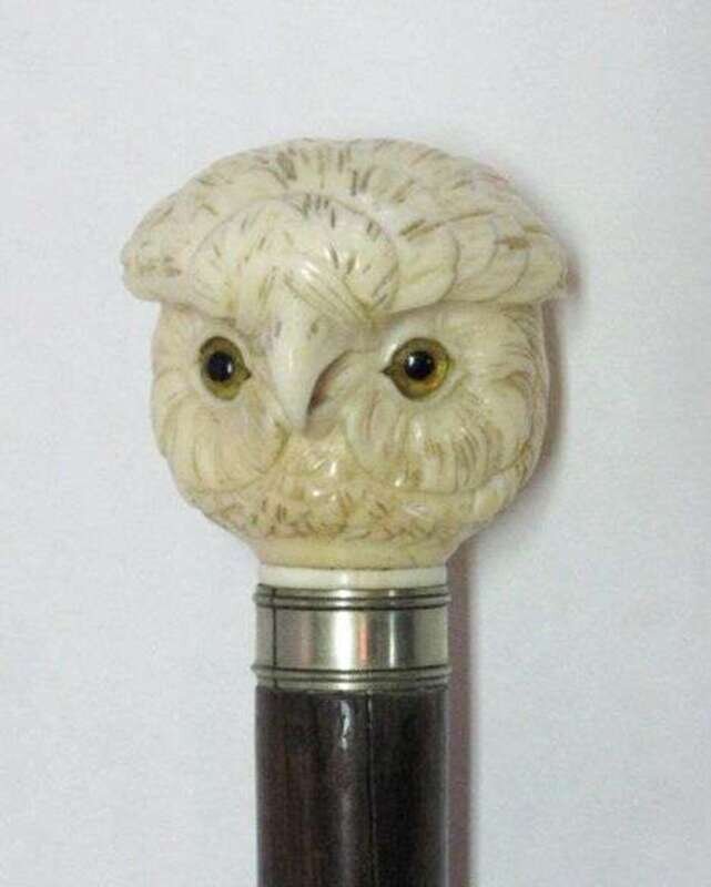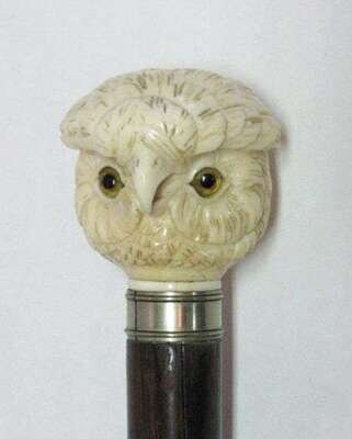 In the form of an owl's head with glass eyes, the naturalistic rosewood tapered shaft with a banded collar. 34 in.