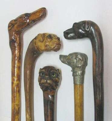 Together with a dog head glove holder cane with glass eyes and tapered shaft. 36 1/2 in. The others approx. 35 in.