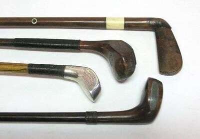 Gorham sterling example inscribed 'Mrs. A.H. Harris, New Rochelle, NY, Women Metropolitan Golf Association, Scotch Foursomes, 1905' . 32 in.; two in the form of woods. 34 & 36 in. The other in the form of an iron, the ivory collar inscribed 'Swaine & Adeney. Ltd. London'. 39 in. (4).
