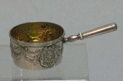 Makers mark S R, stamped 800, the sides with embossed and chased with laurel swags enclosing mask motifs. H: 1 1/4, 2 oz.
