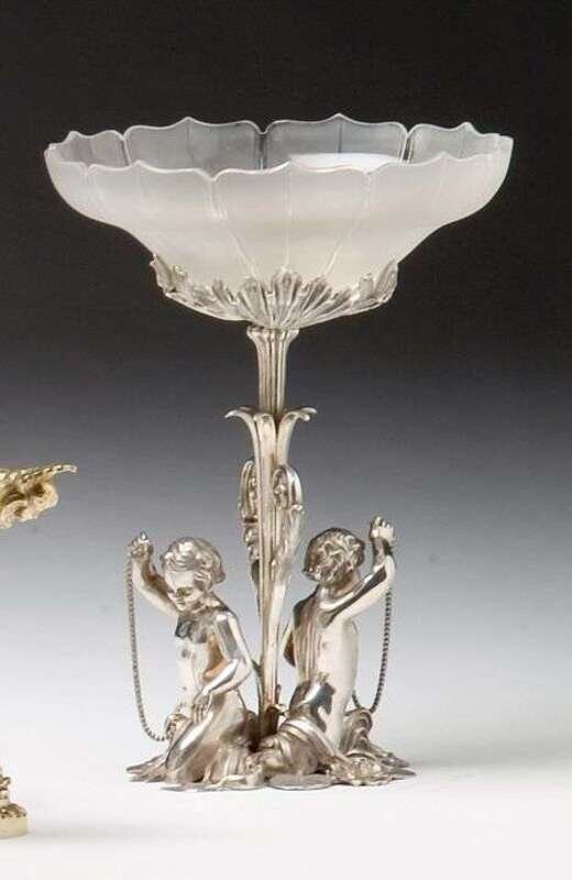 The naturalistic base surmounted by two young boys, centered by a reeded stork-form stem, terminating in a flower-head form cut glass bowl. H: 13 3/4in, 51 oz.