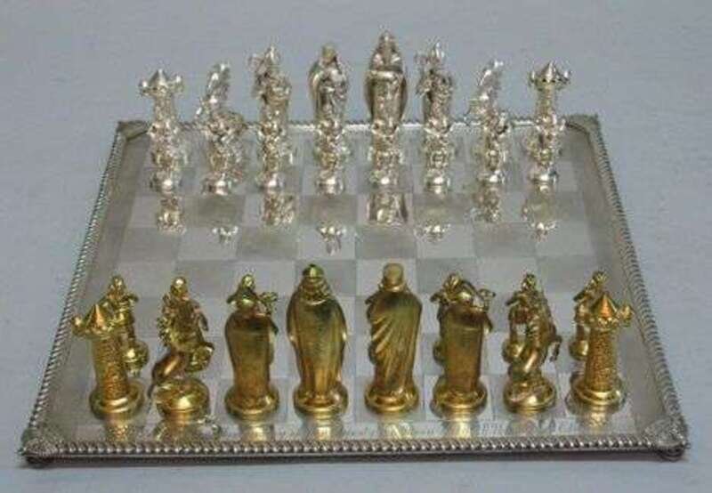 Indian silver commemorative chess board and plated game pieces Calcutta, ca. 1972