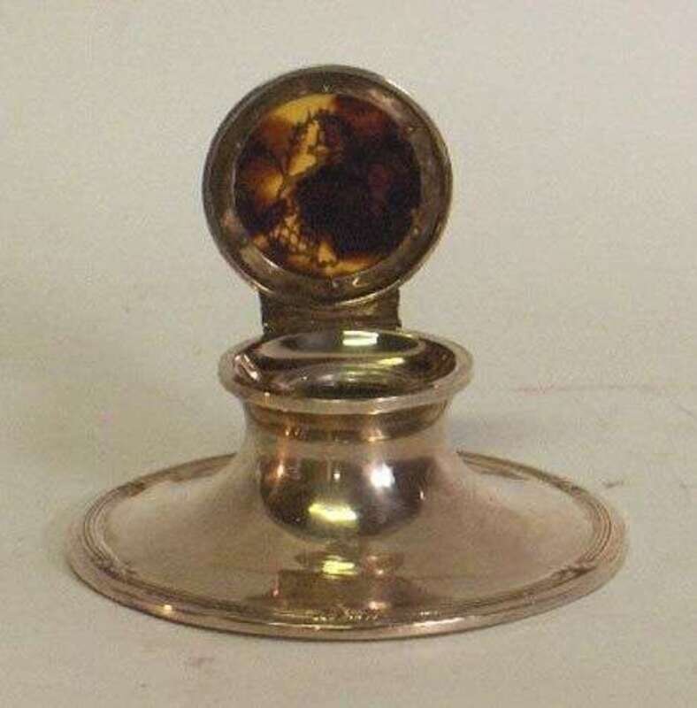 Makers mark, H M, the hinged lid inset with tortoiseshell panel inlaid with silver scrolls and trellis. H: 2 in.