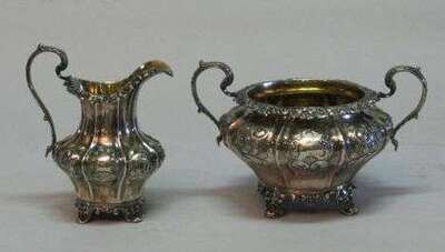 Makers mark I.W, of lobed pear-shape form, chased and embossed with panels of flowers and foliage, raised on four scroll feet. Creamer H: 6 in, sugar bowl W: 8 in. 21 oz.