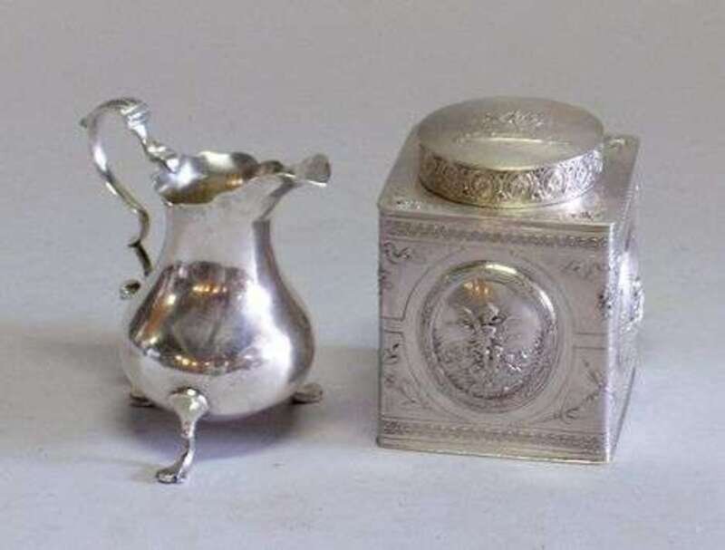 The square sides with embossed oval reserves depicting cherubs; together with a George III silver creamer, London 1760, maker's mark rubbed. H: 3 1/2 in approx. 8 oz.