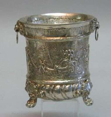 With lion's mask and loop handles, the sides with embossed decoration depicting figures in mountainous and foliate landscapes, below is a gadrooned apron, on three shell cast lion's paw feet. H: 9 in. 48 oz.