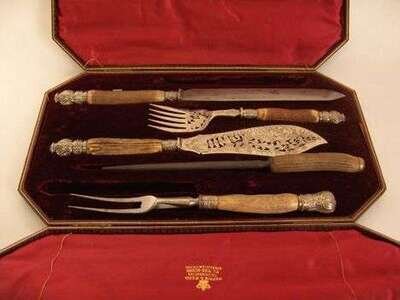 Comprising a carving knife and fork, sharpener, fish slice and fork with pierced silver blades, Sheffield 1889, in a Mappin & Webb case.