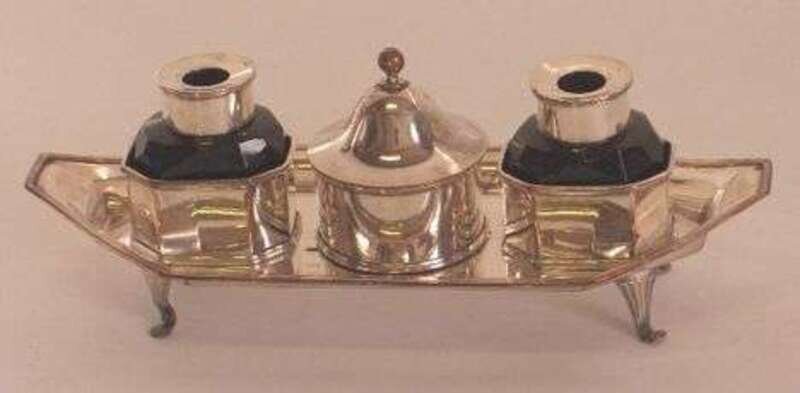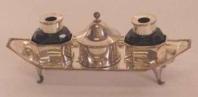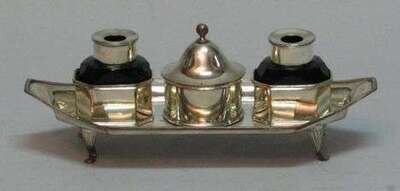 Of boat shape form, with two blue glass inkwells and central cover compartment, on scroll feet. H: 3 1/2, W: 9 1/4 in.