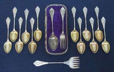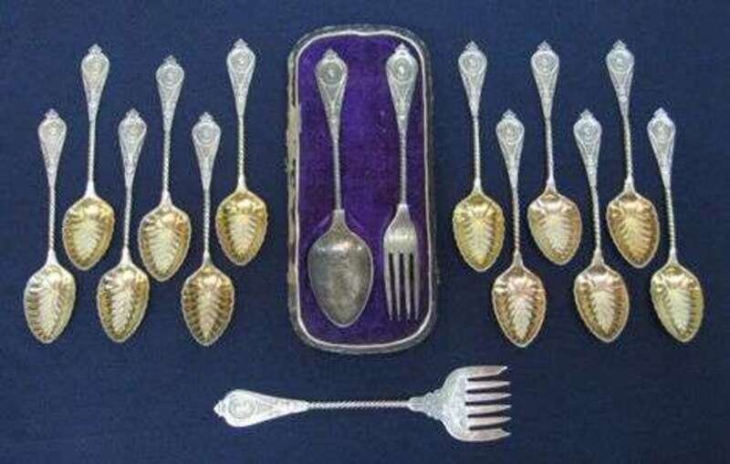 Comprising 12 teaspoons with vermeil bowls, small serving fork with bright cut decoration and a cased christening set, all with spiral twist stems. 10 oz. (15).