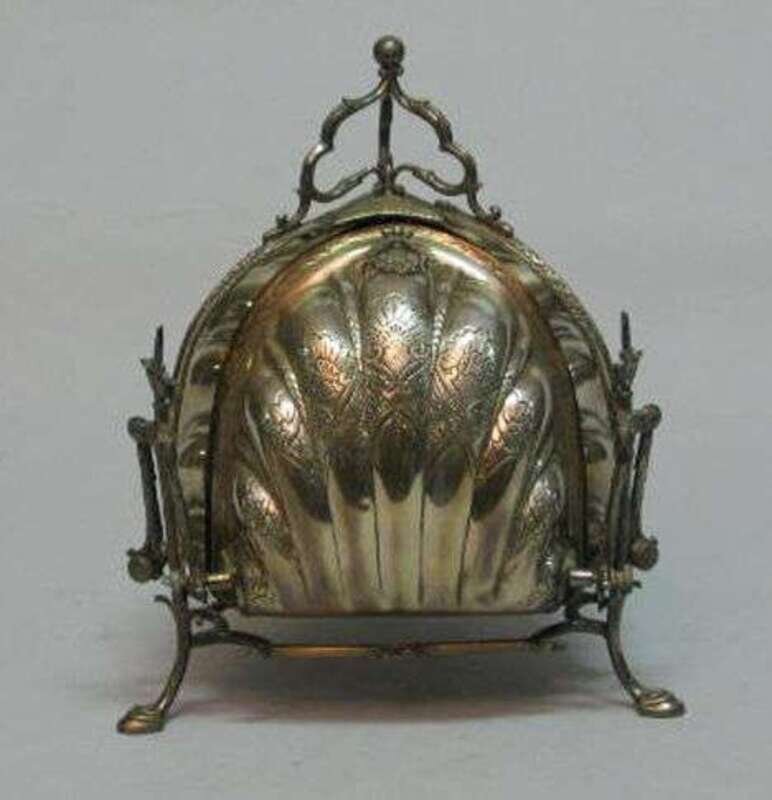 With foliate engraved decoration, of lobed tri-form, the three sides opening to reveal a pierced gilt interior, the openwork frame H: 10 1/2 in. with a ball finial and hoof feet. H: 10 1/2 in.